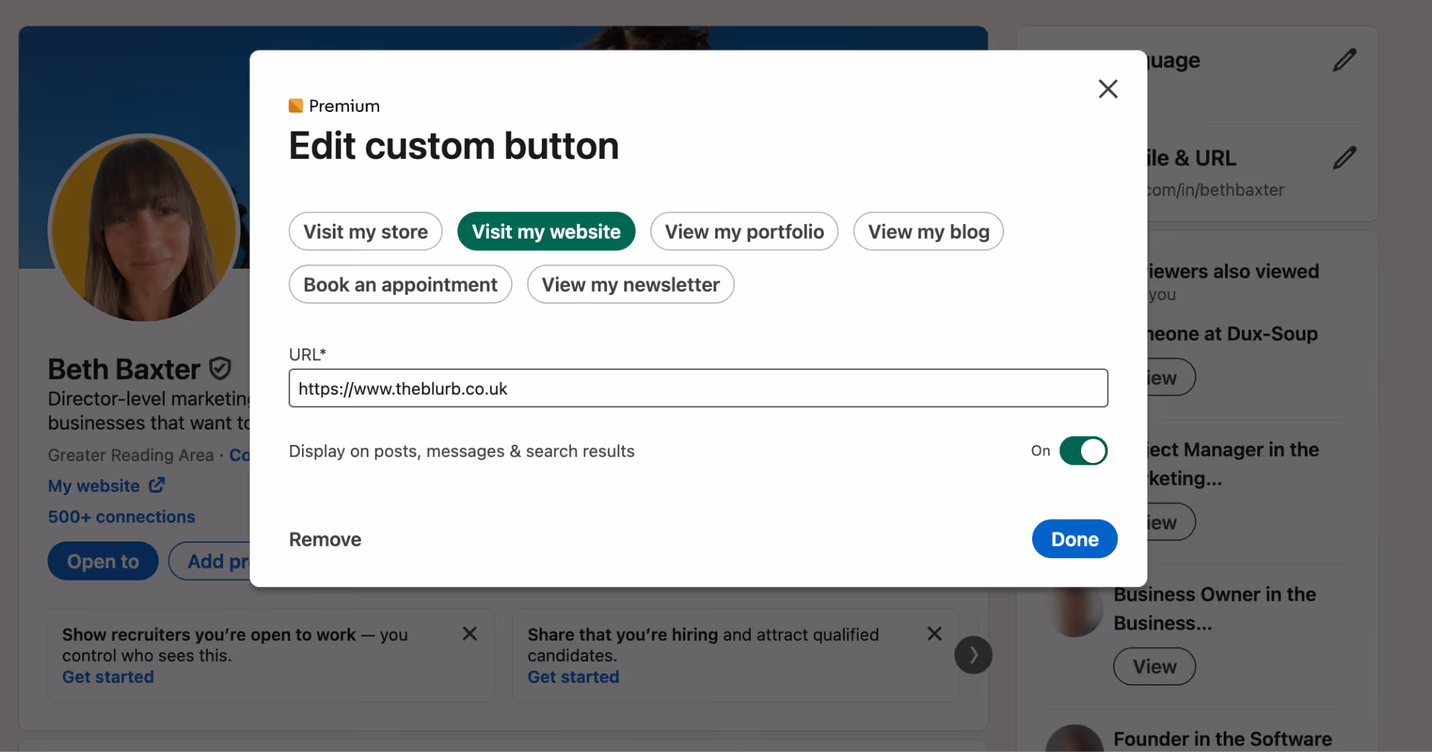 If you have a Premium LinkedIn account, take advantage of LinkedIn’s custom button feature to include your website, portfolio, or booking link. Make it easy for visitors to learn more about you or take the next step. You can edit your custom button from your profile.