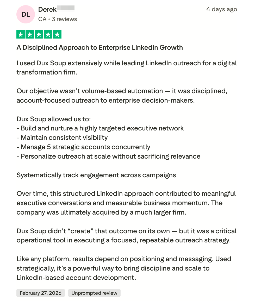 Your feedback helps others understand how Dux-Soup works, what to expect, and which plan best fits their goals. It also helps us keep improving, and that means more than you could ever know!