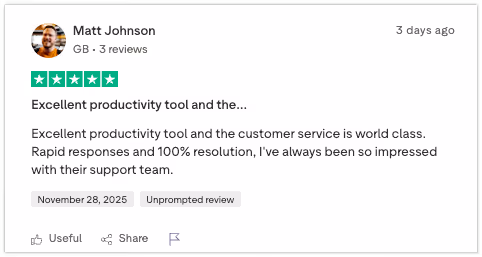 If you’ve got a moment to share your experience on Trustpilot, we’d truly appreciate it. Your voice genuinely shapes what we build next.